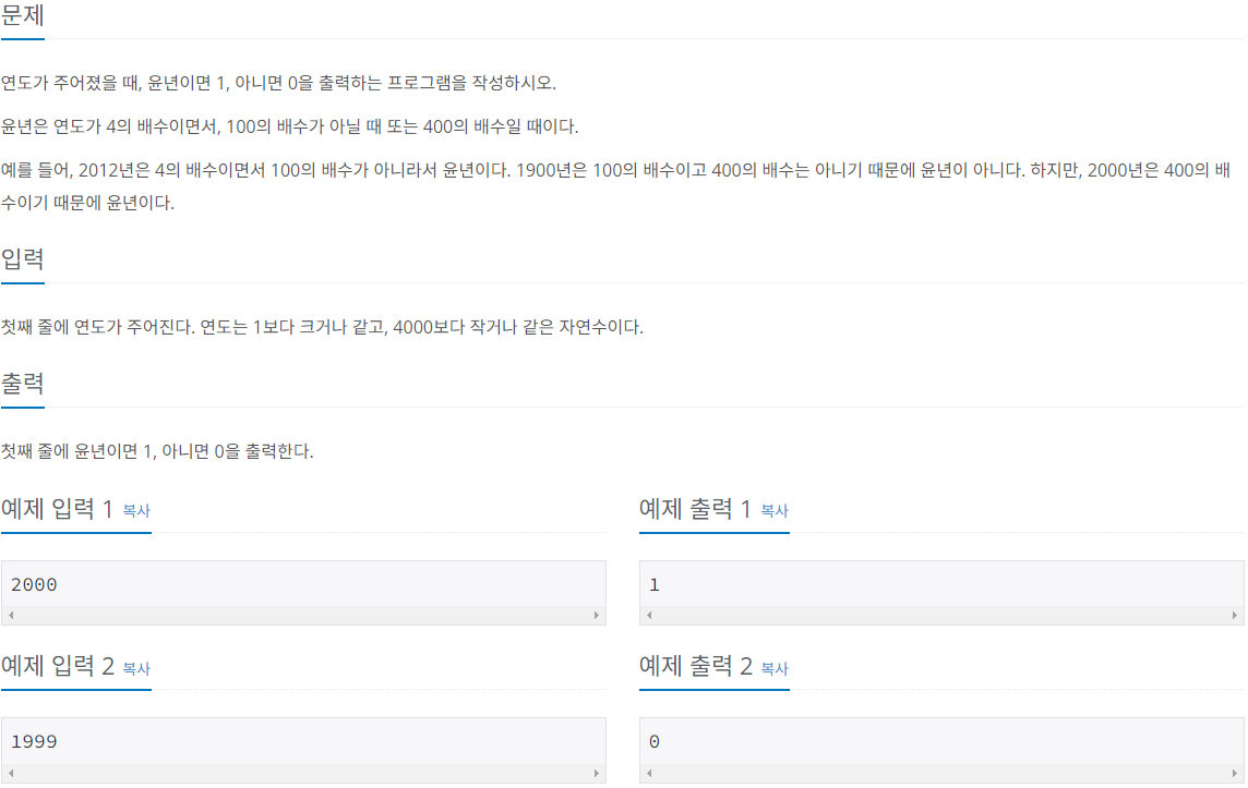 연도가 주어졌을 때, 윤년이면 1, 아니면 0을 출력하는 프로그램을 작성하시오. 윤년은 연도가 4의 배수이면서, 100의 배수가 아닐 때 또는 400의 배수일 때이다. 예를 들어, 2012년은 4의 배수이면서