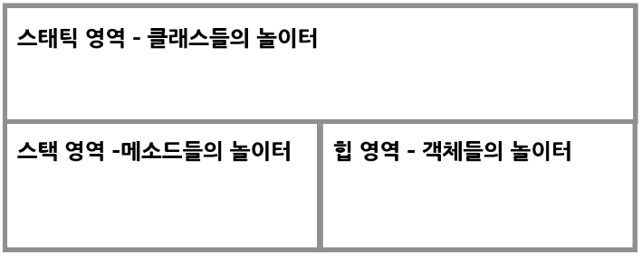 - 이제 모든 전처리 과정이 끝났고, 본격적으로 main 메서드가 실행되면 스태틱 영역이 아닌 스택 영역에 main 메서드의 스택 프레임이 할당된다. 즉, 스택 영역은 메서드들의 놀이터이다. { 메서드 단위별로 스택 영역에 프레임 단위로 할당}