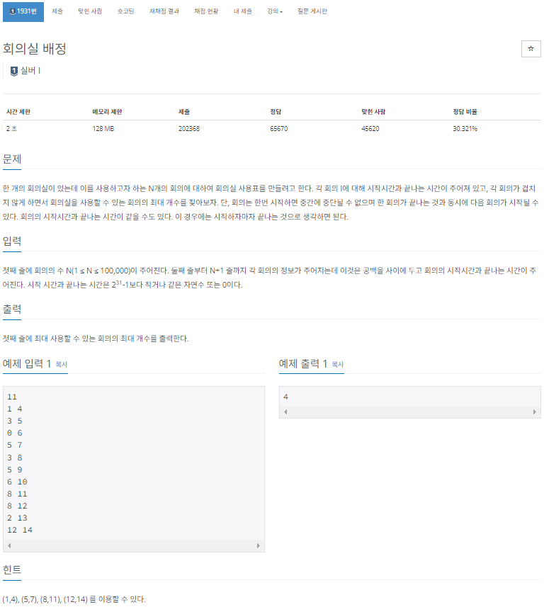 https://www.acmicpc.net/problem/1931