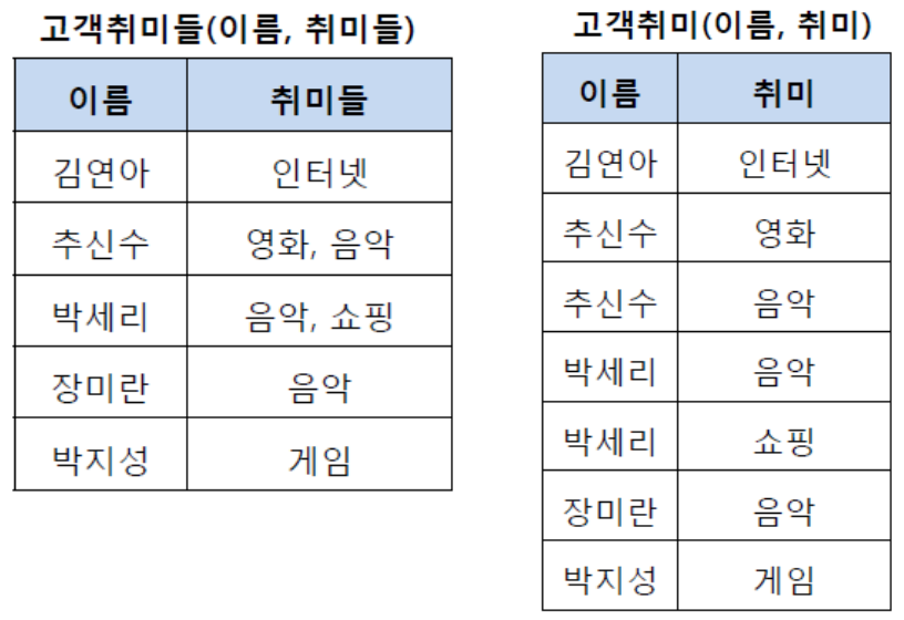 1차 정규화는 테이블의 컬럼이 원자값(Atomic Value)을 갖도록 하는 것을 의미합니다.