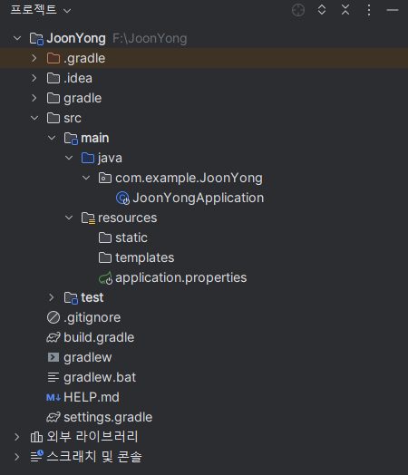 스프링 부트 프로젝트를 처음 생성하면, 주로 다음과 같은 폴더 구조를 가지게 됩니다.