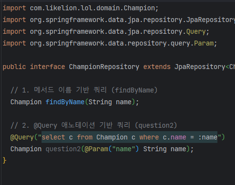 이 예제에서 findByName 메서드는 Spring Data JPA가 자동으로 SELECT * FROM Champion WHERE name = ?와 같은 SQL 쿼리를 생성하도록 합니다.