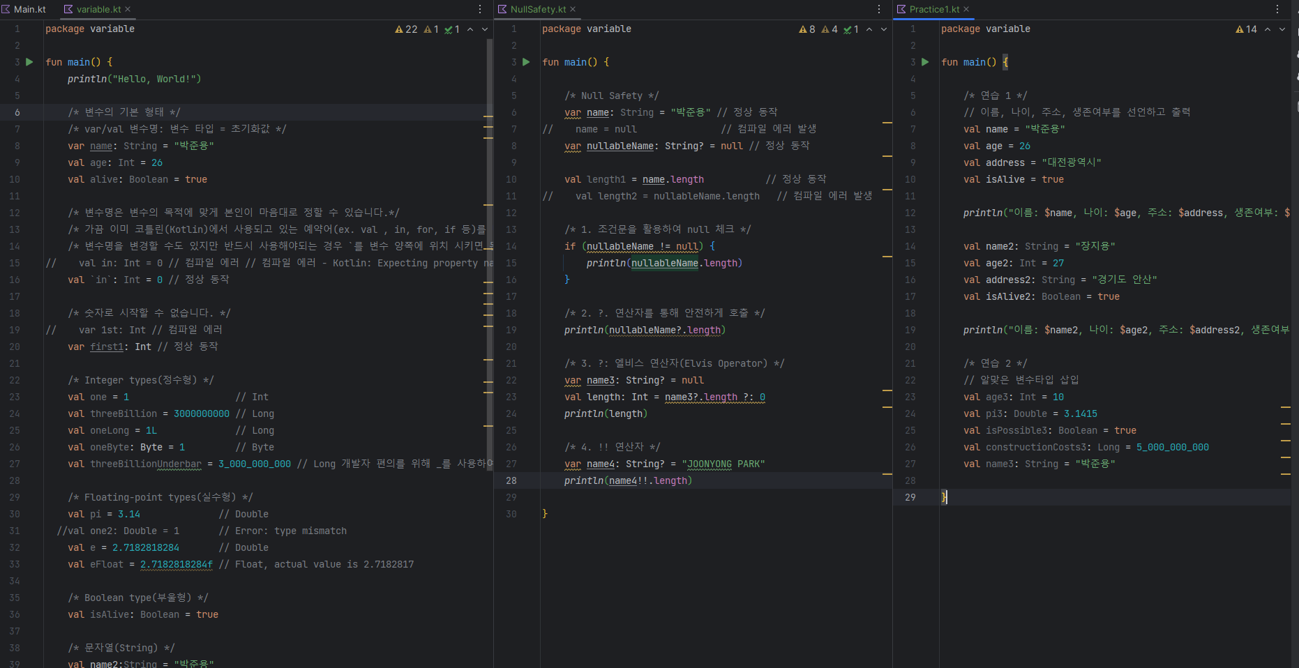 - nullable한 변수를 사용할 때 이 변수가 null 인지 아닌지 고려하며 사용해야 합니다.
