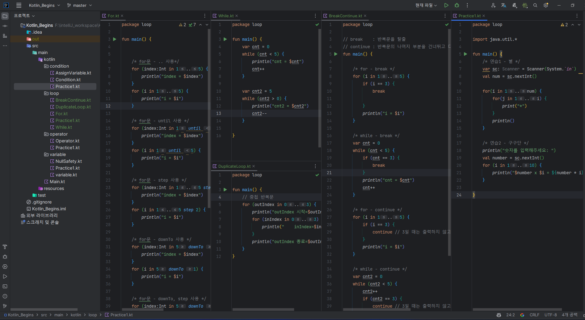 반복문은 특정 로직을 반복 실행할 때 사용합니다. 코틀린(Kotlin)에서는 for와 while을 제공합니다.