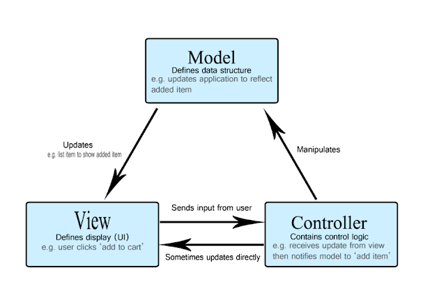 - Updates: Model은 비즈니스 로직을 통해 DB 및 파일과 같은 데이터를 제어한 후 결과를 반환한다. 이후 Controller는 Model에게 반환받은 결과를 View에 반영한다.